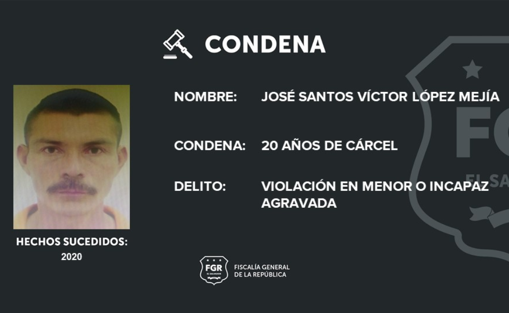 José Santos Víctor López Mejía fue sentenciado a 20 años de cárcel tras ser hallado culpable de cometer agresiones graves, de caracter sexual, contra una menor de edad en el distrito de San José Villanueva, en el departamento de La Libertad.