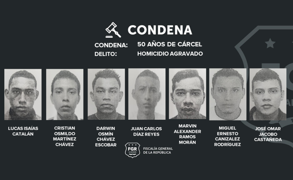 Los condenados fueron identificados como Cristian Osmildo Martínez Chávez, Lucas Isaías Catalán Contreras, Miguel Ernesto Canizales Rodríguez, Juan Carlos Díaz Reyes, Marvin Alexander Ramos Morán, Darwin Osmín Chávez Escobar y José Omar Jacobo Castañeda.