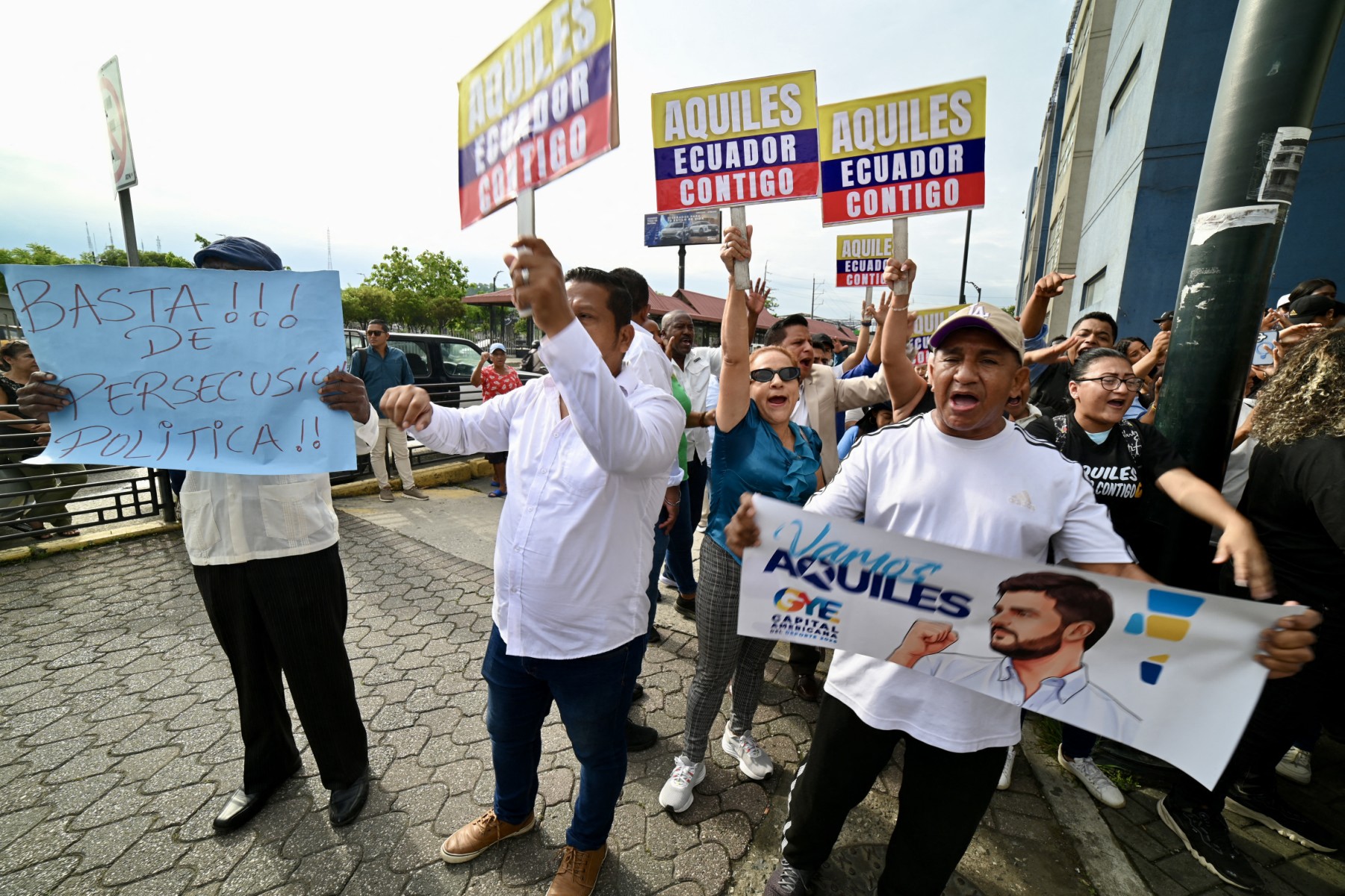 Levantaban carteles con la leyenda “Vamos Aquiles”. Al grito de “Aquiles, amigo, el pueblo está contigo”, mostraron su apoyo al funcionario, quien denuncia la falta de resultados en la guerra anticrimen que impulsa Noboa.