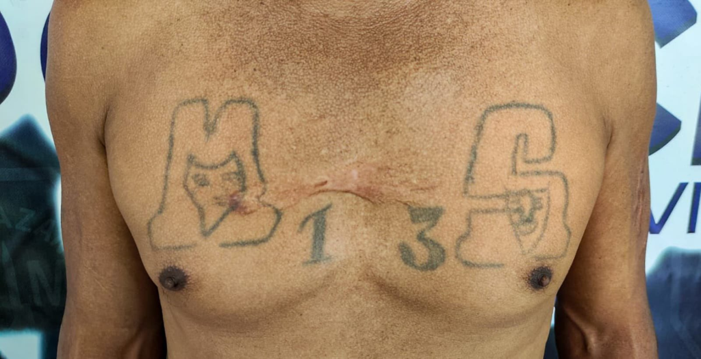 Tatuajes alusivos a la pandilla MS en el pecho de Argueta (Foto vía PNC).