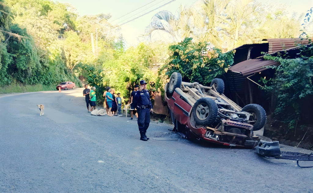 La Policía Nacional Civil (PNC) reportó que dos personas resultaron lesionadas luego de que el vehículo en el que viajaban volcara sobre la carretera que conduce de Tacuba hacia Ahuachapán, a la altura del barrio San Nicolás. El percance ocurrió en una zona transitada por residentes y comerciantes del sector.