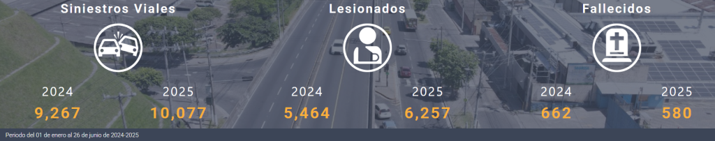 De acuerdo con el Observatorio Nacional de Seguridad Vial, entre el 1 de enero y el 26 de junio de 2025 se han registrado 10,077 siniestros viales, con un saldo de 6,257 personas lesionadas y 580 fallecidos.