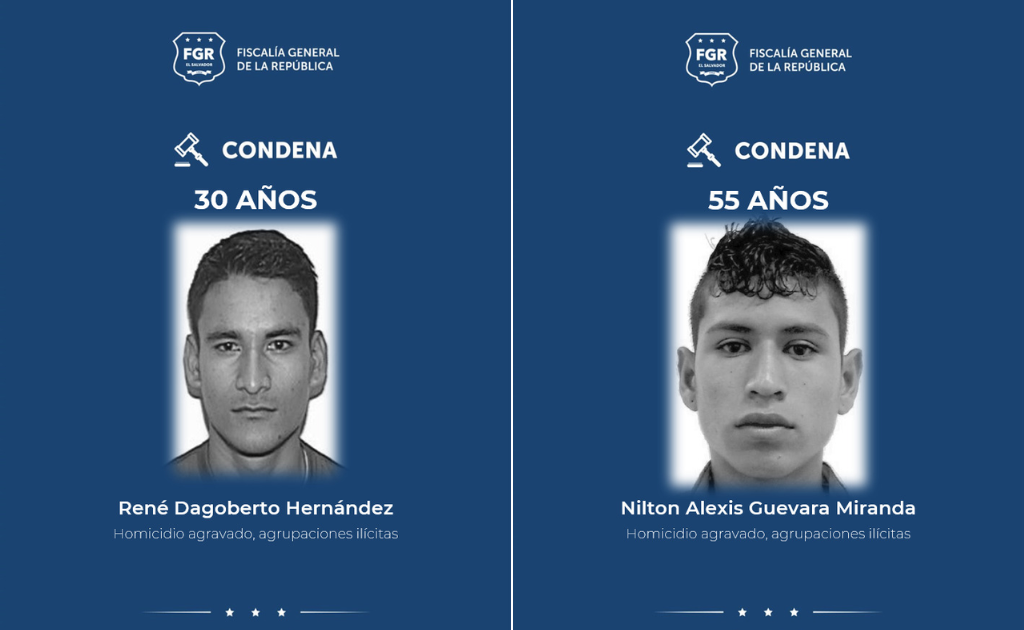 Nilton Alexis Guevara Miranda fue condenado a 55 años de prisión y René Dagoberto Hernández a 30 años de cárcel, tras ser encontrados culpables de los delitos de homicidio agravado y agrupaciones ilícitas