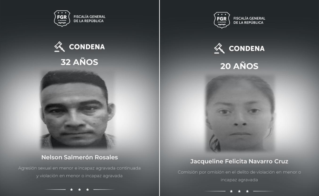 El Tribunal Primero de Sentencia de Santa Tecla emitió condenas de 32 años de prisión para Nelson Salmerón Rosales y 20 años para Jaqueline Felicita Navarro Cruz, tras ser encontrados culpables de graves delitos de carácter sexual cometidos en perjuicio de una menor de edad.
