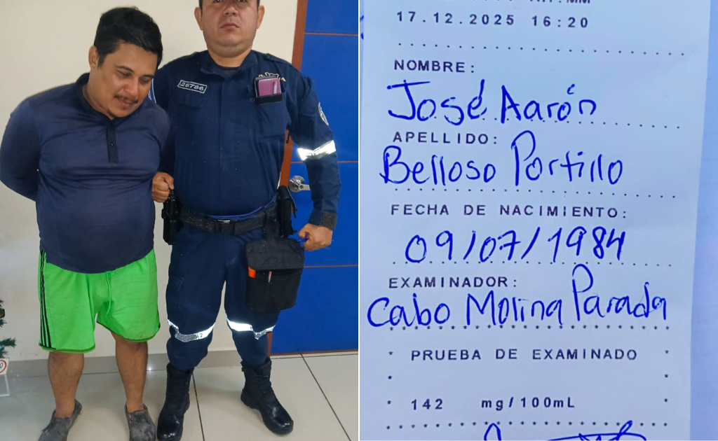 A la izquierda, José Belloso esposado por conducir bajo efectos del alcohol. A la derecha, resultado de prueba de alcotest realizada a Belloso (Fotos vía PNC).