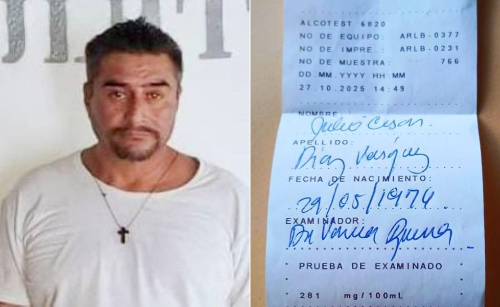 A la izquierda se encuentra Julio César Díaz Vásquez, a la derecha la prueba de alcotest con resultado de 281° de alcohol (Foto vía PNC).