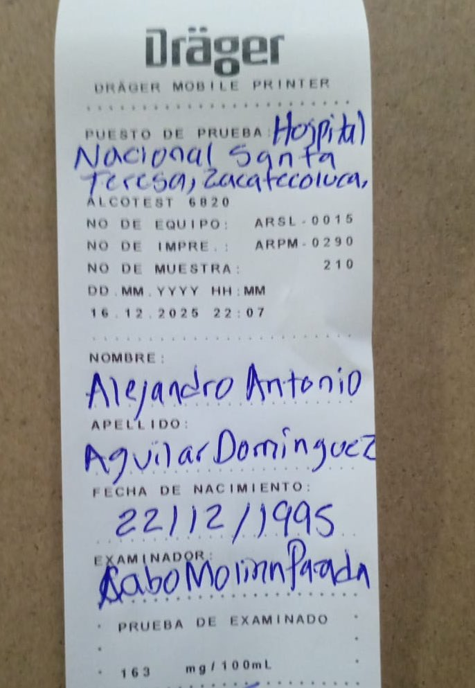 Resultado de alcotest de Alejandro Antonio Aguilar Domínguez (Foto vía PNC).