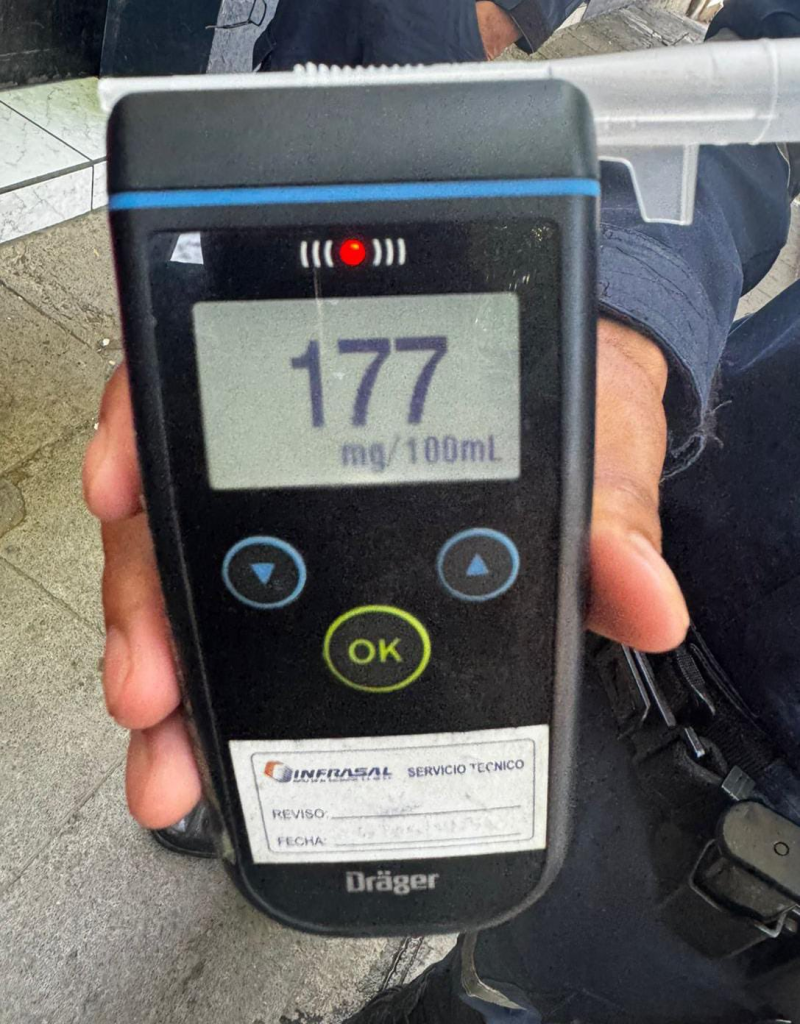 Horas más tarde, en el corazón de San Miguel Centro, agentes capturaron a Gerson Isael Lazo Salvador, de 51 años, luego de que fuera sorprendido manejando en evidente estado de ebriedad sobre la avenida Las Conchas, en la 8ª calle poniente, colonia Ciudad Pacífica. La prueba de alcotest confirmó 109 grados de alcohol en su organismo.