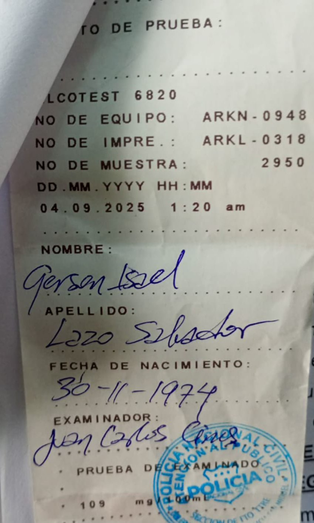 Resultado de alcotest hecho a Gerson Isael Lazo (Foto PNC).