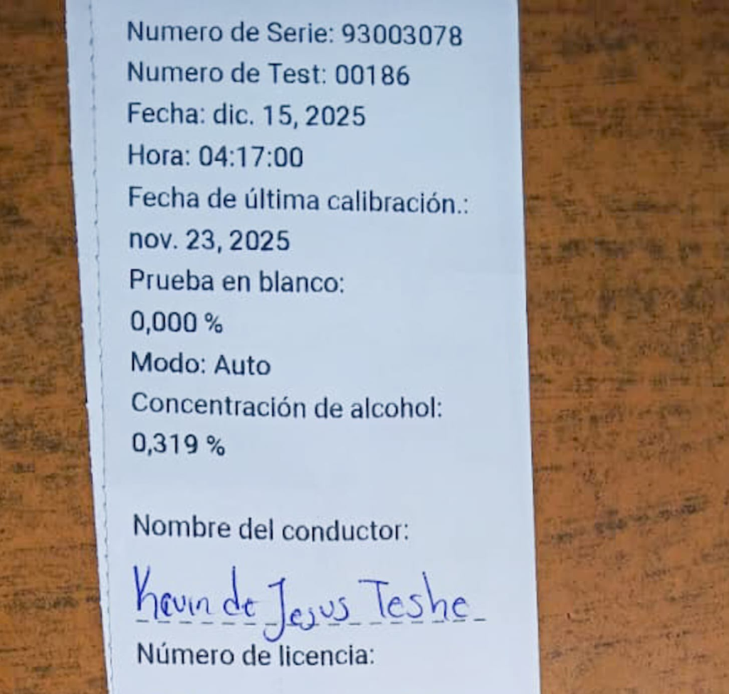 Resultado de alcotest realizado a Kevin de Jesús Teshe Delgado (Foto vía PNC).