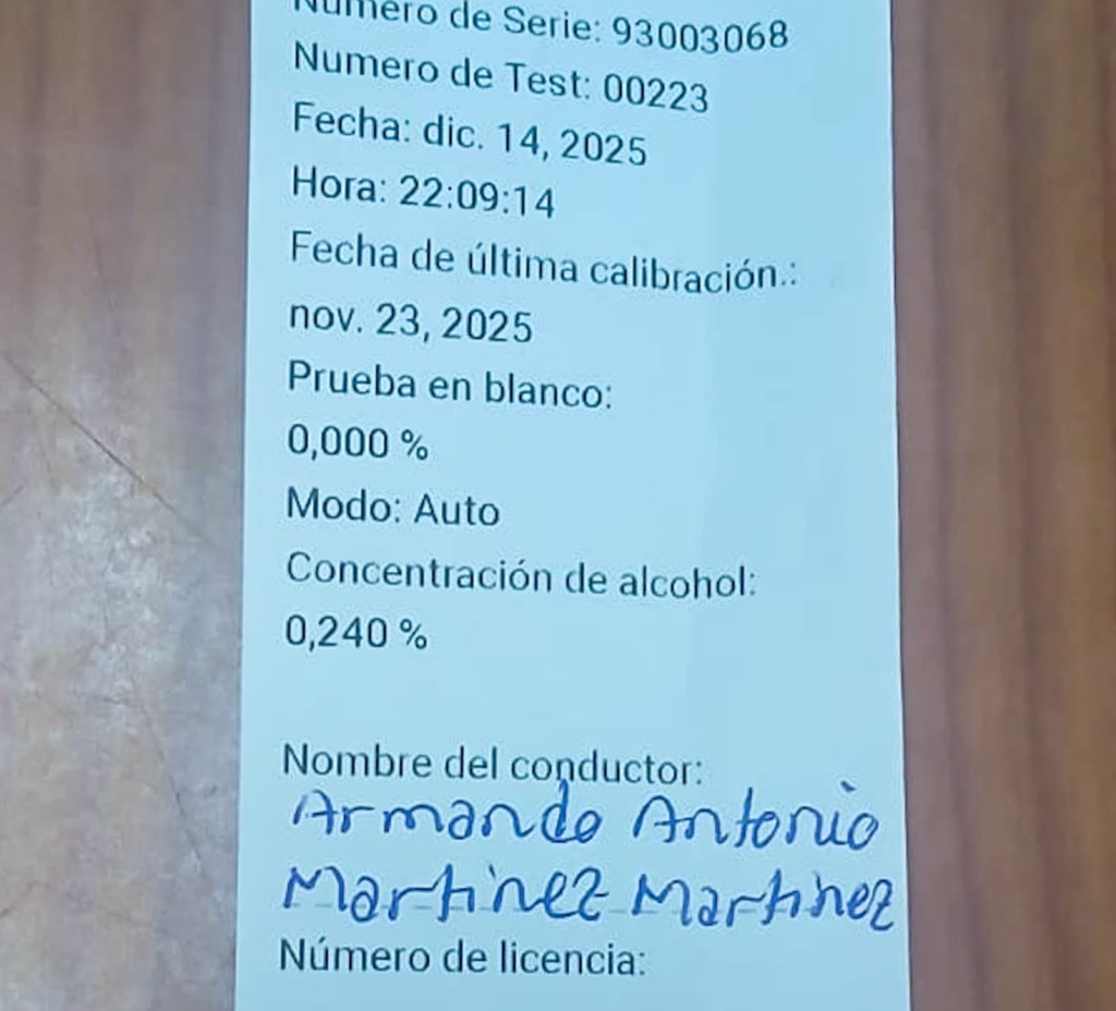 Resultado de alcotest realizado a Armando Antonio Martínez Martínez (Foto vía PNC).
