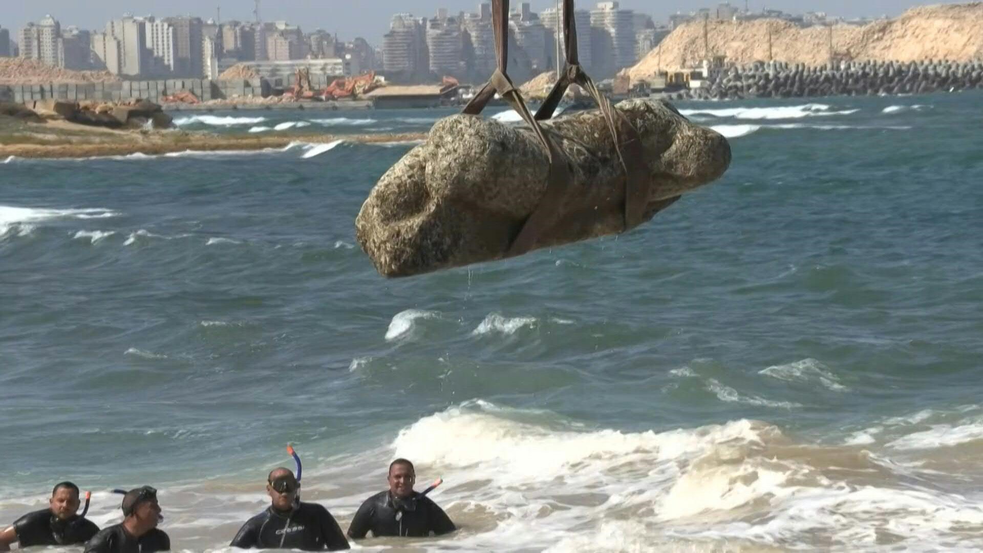El jueves grúas levantaron lentamente varias estatuas a la superficie. “Hay muchísimos elementos bajo el agua, pero lo que podemos recuperar es limitado; son solo piezas seleccionadas según criterios estrictos”, declaró el ministro de Turismo y Antigüedades, Sherif Fathi.