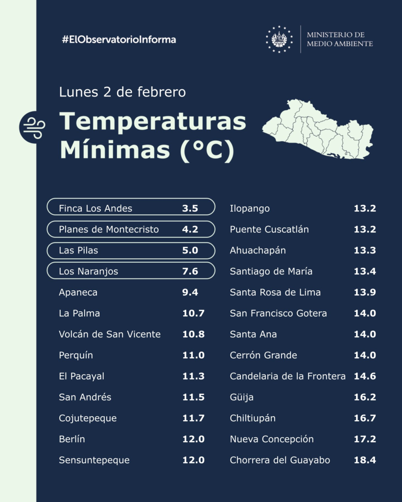 Temperaturas mínimas registradas el lunes 2 de febrero en En Salvador (Vía Ministerio de Medio Ambiente).