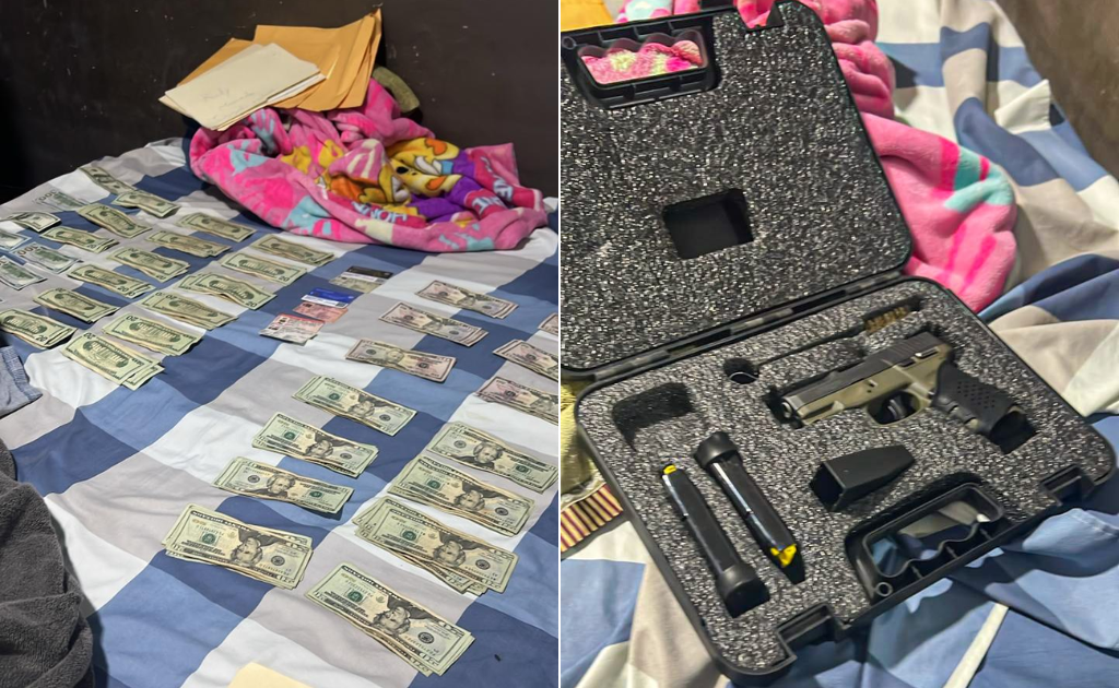 Evidencia incautada en operativo muestra dinero en efectivo y un arma de fuego / Fotos cortesía FGR.