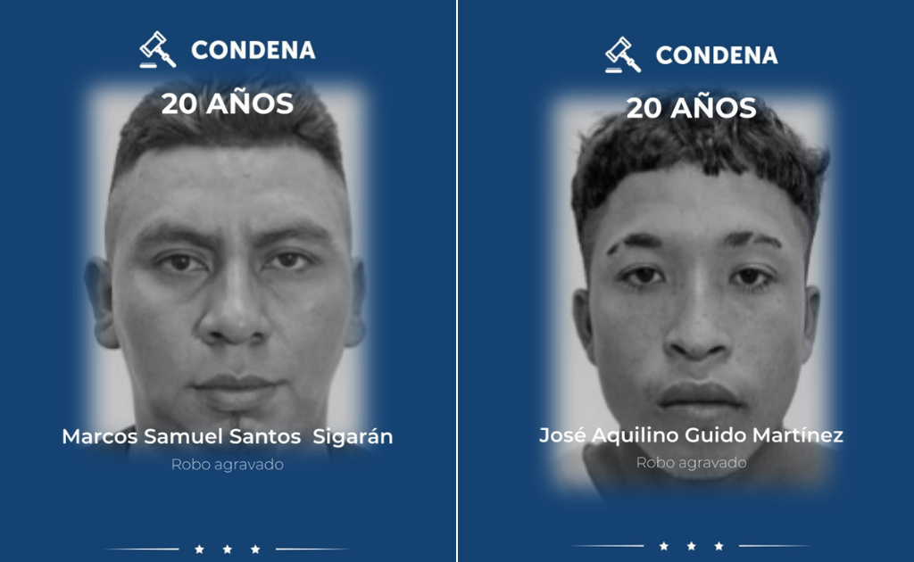 La Fiscalía General de la República (FGR) informó que Marcos Samuel Santos Sigarán y José Aquilino Guido Martínez fueron condenados a 20 años de prisión tras ser hallados culpables del delito de robo agravado, cometido en Berlín, Usulután.