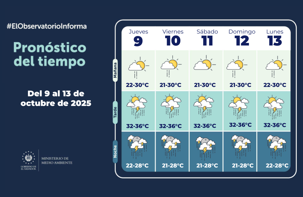 Del 9 al 13 de octubre de 2025 se prevé un clima caluroso durante el día, con temperaturas máximas entre 32 y 36 grados Celsius y mínimas entre 21 y 28 grados por la noche. Las mañanas estarán parcialmente nubladas, mientras que en las tardes y noches se esperan lluvias acompañadas de tormentas eléctricas en todo el país.