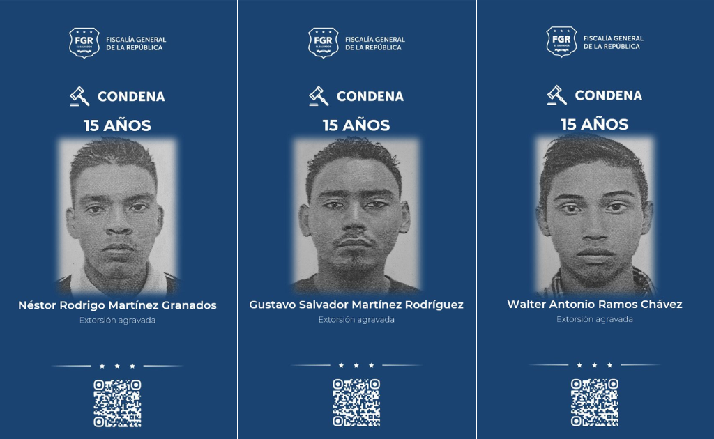 La Fiscalía General de la República informó que tres pandilleros del Barrio 18 fueron condenados a 15 años de prisión cada uno, tras comprobarse que extorsionaron durante varios meses a una víctima en El Paisnal, en la zona de San Salvador Norte.