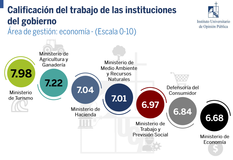 En cuanto a las instituciones del Ejecutivo, el Ministerio de Turismo fue el mejor evaluado con una calificación de 7.98, seguido por otras carteras de Estado con notas destacadas. En contraste, el Ministerio de Vivienda obtuvo la peor calificación, con una nota de 5.97.