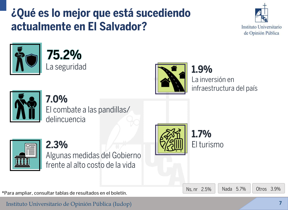 La encuesta también identificó los principales temas que preocupan a la población. El 75.2 % de los encuestados señaló que la seguridad es el aspecto más positivo en el país actualmente, mientras que la economía, el desempleo y el alto costo de la vida fueron destacados como los problemas más urgentes.