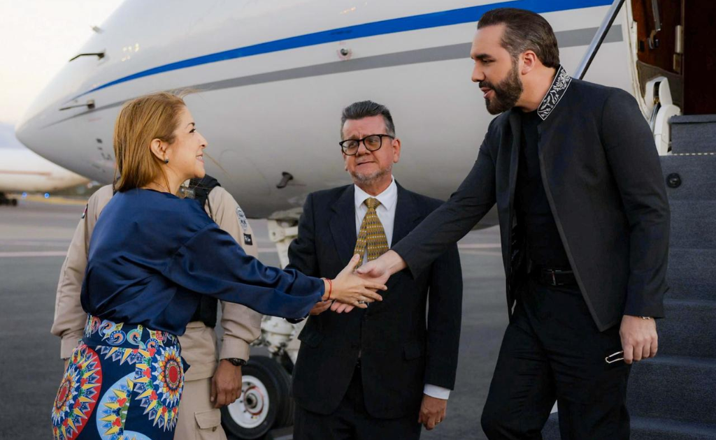 El presidente de la República, Nayib Bukele, arribó al Aeropuerto Internacional Juan Santamaría, en Costa Rica, donde fue recibido por la vicepresidenta de ese país, Mary Munive Angermüller, como parte de una visita oficial.