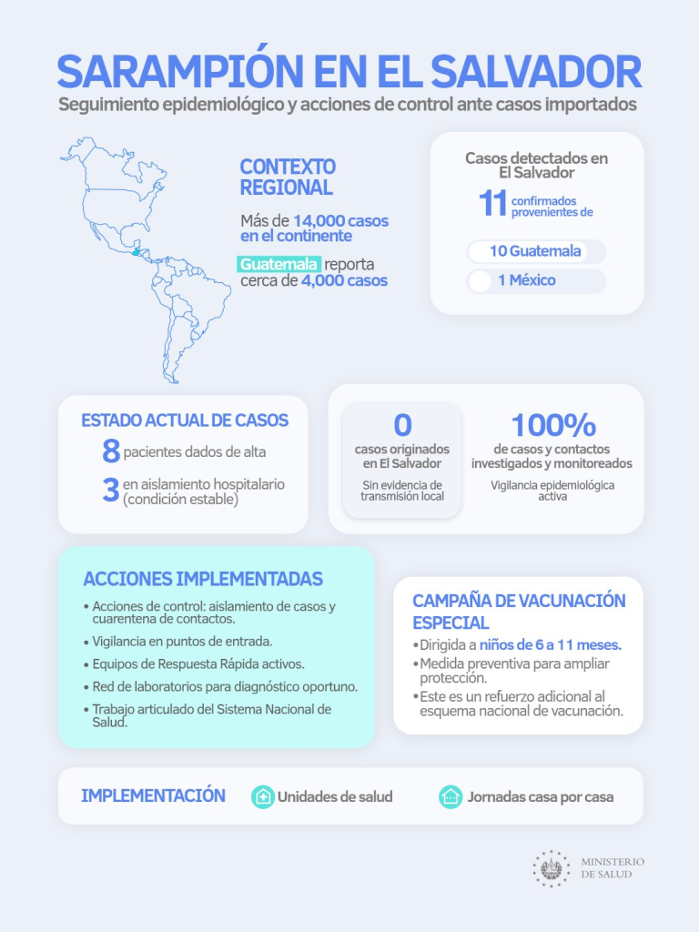 El Ministerio de Salud informó que los casos de sarampión detectados en El Salvador corresponden a contagios importados, sin evidencia de transmisión local. Según la institución, hasta la fecha se registran 11 casos confirmados, los cuales han sido investigados y permanecen bajo seguimiento epidemiológico, junto a sus contactos.