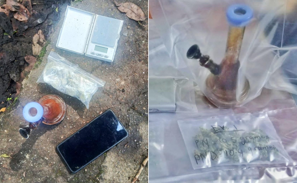 Los detenidos fueron identificados como Edgar Gael Amaya Amaya, a quien se le incautaron cuatro porciones de marihuana, una pipa de vidrio y un celular, y Diego Alejandro Alas Martínez, a quien se le encontraron cinco bolsas pequeñas con marihuana, una balanza digital y un celular.