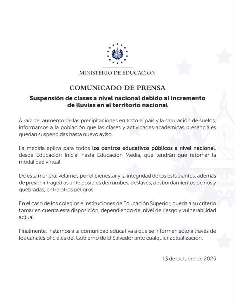 Finalmente, el Ministerio hizo un llamado a la comunidad educativa a informarse únicamente a través de los canales oficiales del Gobierno de El Salvador para conocer cualquier actualización sobre esta medida.