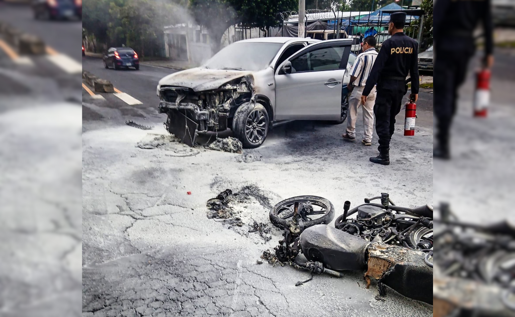 La Policía Nacional Civil (PNC) reportó un fuerte accidente de tránsito ocurrido esta mañana sobre el bulevar San Bartolo, en el distrito de Ilopango, que dejó como saldo una camioneta y una motocicleta completamente incendiadas tras la colisión.