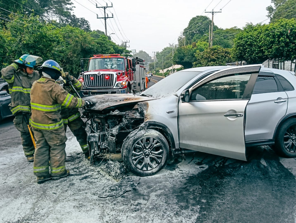 Bomberos inspeccionan un automóvil que se incendió en el bulevar San Bartolo (Foto vía Bomberos de El Salvador).